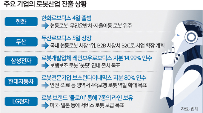 한화그룹의 로봇전문기업인 한화로보틱스가 출범하고, 국내 협동로봇 시장 점유율 1위인 두산로보틱스가 상장을 앞두고 있다. 삼성전자와 현대자동차, LG전자도 이미 글로벌 로봇 기업에 투자해 미래 먹거리 다지기에 나서는 등 국내 로봇시장 규모는 점차 확대되고 있다.