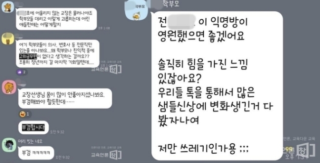 서울 강남의 한 초등학교 학부모들이 단체 대화방을 개설한 뒤 교사들에게 지속해서 갑질하고 인신공격성 발언을 한 사실이 드러나 뭇매를 맞은 가운데, 해당 학교 학부모회에서 교사들에게 응원 메시지를 보내자고 나섰다.