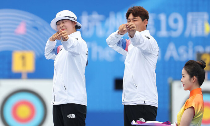 이우석(26·코오롱)과 임시현(20·한국체대)은 4일 중국 항저우의 푸양 인후 스포츠센터에서 열린 양궁 리커브 혼성전 결승에서 일본의 후루카와 다카하루, 노다 사쓰키를 세트 점수 6-0(38-37 37-35 39-35)으로 완파하고 우승했다.