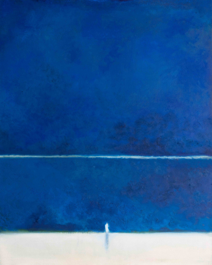 푸른 밤하늘 아래 작은 인물 형상 하나를 배치한 회화는 2021년부터 2023년까지 연작의 형태로 제작한 화면 중 하나다. 고독의 순간, 더없이 작게 묘사된 존재의 부피가 광활한 남청색의 우주와 극명한 대비를 이룬다. 작은 인물은 늘 화면 하단부 중앙에 자리 잡은 모습이다. 지표처럼 심어 둔 자아의 형상이 특유의 자전적인 분위기를 만들어낸다.