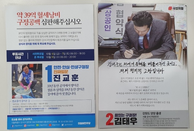 앞서 사전투표소 20곳과 투표소 131곳을 확정한 강서구선거관리위원회가 지난 1일 강서구 각 가정에 발송한 두 후보의 공보물에서도 그동안 여야가 앞다퉈 내걸었던 상대 후보 비판이나 출마 정당성을 부각하는 내용이 빠지지 않아 주목된다.