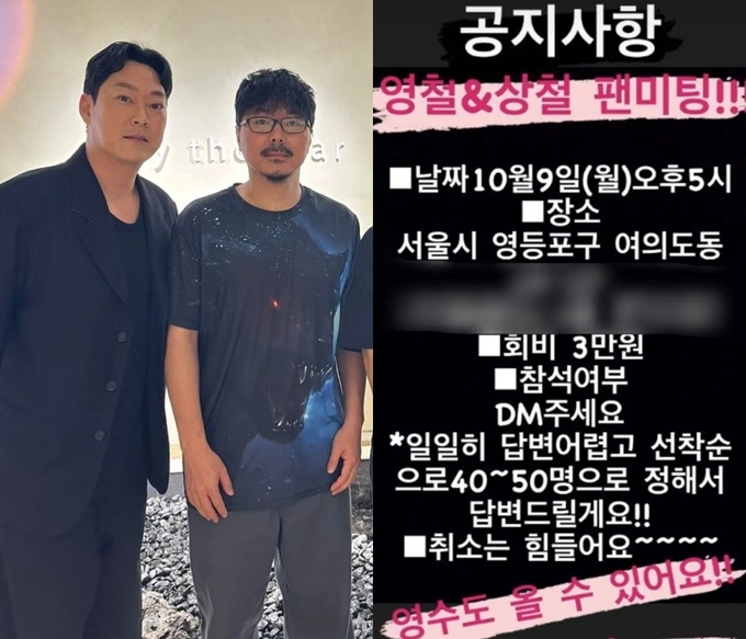 지난 8일 영철은 자신의 사회관계망서비스(SNS)에 “공지사항 영철&상철 팬미팅”이라며 “회비 3만원, 참석여부 DM(개인메시지)주세요. 일일이 답변 어렵고 선착순으로 40∼50명으로 정해서 답변 드릴게요. 취소는 힘들어요”라고 알리며 “영수도 올 수 있어요”고 덧붙였다.