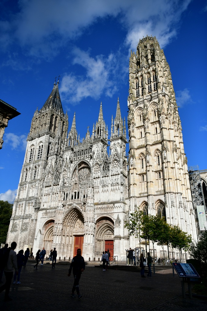 루앙 대성당은 여러차례 첨가되고 보수되면서 다양한 고딕 건축 양식이 혼합된 특이한 건축물이다. 보통 정면 파사드를 중심으로 좌우 탑이 대칭을 이루지만 루앙 대성당은 비대칭이다. 나중에 지은 오른쪽 탑은 끝이 평면인 버터 타워, 왼쪽은 끝이 뾰족한 첨탑인 로만타워로 불린다. 버터 상인들에게서 거둬들인 세금으로 탑을 지어 이런 이름이 붙었단다. 종탑에는 프랑스에 가장 무거운 10t짜리 잔 다르크종이 달려있고 성모 마리아의 대관식 장면을 담은 로즈 윈도우와 예수의 고난을 묘사한 15세기 스테인드글라스가 유명하다.