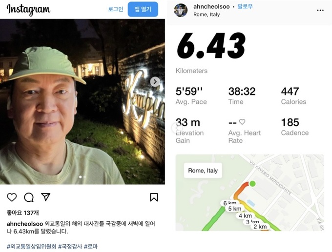 안 의원은 19일 자신의 사회관계망서비스(SNS)에 글을 올려 “외교통일위원회의 해외 대사관 국감 중에 새벽에 일어나 6.43㎞를 달렸다”는 글과 함께 사진 두 장을 게재했다. 외통위가 현지시간으로 18일 로마의 주이탈리아대사관에서 주이탈리아·주영국·주교황청 대사관 대상 국정감사를 한 점으로 미뤄 안 의원이 로마 시내를 달린 것으로 보인다.