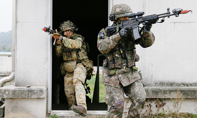한·영 양국군 장병들이 도시지역 훈련장에서 목표건물을 확보하고 있다. 육군 제공