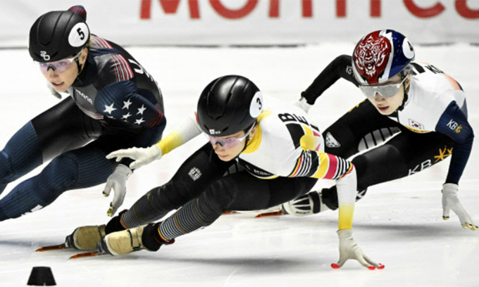 쇼트트랙 국가대표 김길리(성남시청·오른쪽)가 23일 캐나다 몬트리올에서 열린 2023∼2024시즌 국제빙상경기연맹(ISU) 월드컵 1차 대회 여자 1000 2차 레이스 결승에서 역주하고 있다. 마지막 곡선 주로까지 3위로 처져있던 김길리는 앞서 달리던 한느 드스멧(벨기에)과 크리스틴 산토스-그리즈월드(미국)가 몸싸움을 펼치는 사이 이들을 제치고 1분30초998의 기록으로 우승을 차지했다. 이날 남자 1000 2차 레이스 결승에선 김건우(스포츠토토)가 1분26초712의 기록으로 금메달을 차지했다.