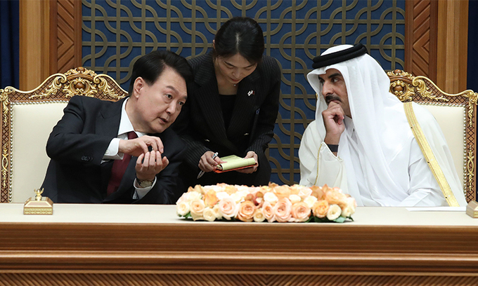 “상호 호혜적 관계로” 입력 : 2023-10-25 21:46:15 수정 : 2023-10-25 21:46:14 구글 네이버 유튜브 카타르를 국빈 방문 중인 윤석열 대통령이 25일(현지시간) 도하 아미리 디완 왕궁에서 열린 한·카타르 양해각서(MOU) 서명식을 마친 뒤 타밈 빈 하마드 알사니 국왕과 대화하고 있다. <뉴시스>뉴시스> Copyright ⓒ 세계일보. 무단 전재 및 재배포 금지 뉴시스