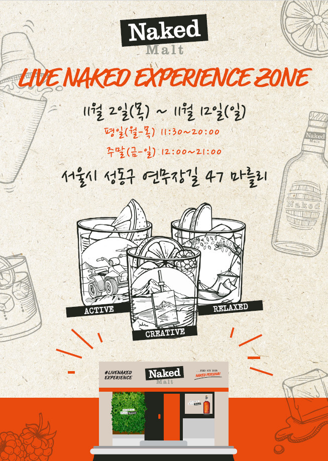 프리미엄 몰트 위스키 브랜드 ‘네이키드 몰트’가 11월 2일부터 12일까지 성수 마를리에서 팝업스토어 ‘Live Naked Experience Zone’을 진행한다.