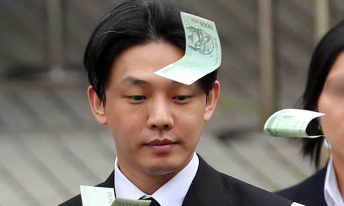 배우 유아인(본명 엄홍식)이 지난 9월 21일 서울 서초구 서울중앙지법에서 열린 마약류 관리에 관한 법률 위반 등 혐의 구속 전 피의자 심문(영장실질심사)을 마친 후 대기 장소로 이동하는 중 한 시민이 "영치금으로 쓰라"며 돈을 뿌리고 있다. 뉴시스