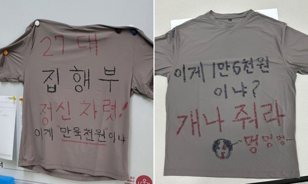 조합원들은 티셔츠에 “걸레짝 같은 쓰레기를 사왔느냐”, “개나 입혀라”라고 적는 등 거세게 항의했다. 이어 “노조 집행부가 구매한 티셔츠의 가격에 대한 합리적 근거를 공개하라”고 요구했다.