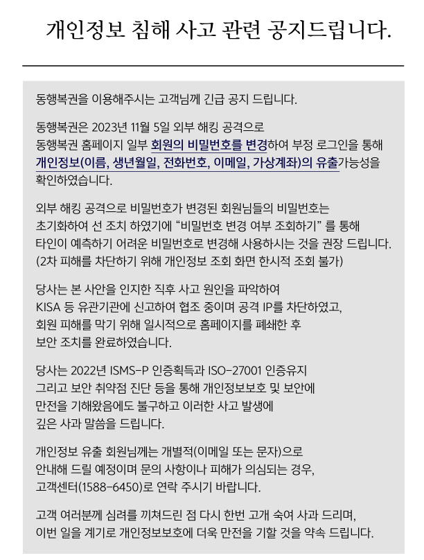 동행복권 측은 이어 “개인정보보호 및 보안에 만전을 기해왔음에도 불구하고 이러한 사고 발생에 깊은 사과 말씀을 드린다”며 “피해가 확산되지 않도록 시스템 점검을 긴급하게 시행하고 있다”고 전했다.