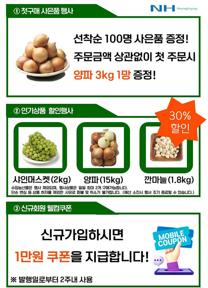농협은 수원원예점 오픈을 기념하여 오는 13일까지 ▲첫 주문시 양파(3kg/1망) 증정 ▲인기상품 30% 할인 ▲신규회원 웰컴쿠폰 지급 이벤트를 진행하고 있으며, 자세한 내용은 온라인 식자재몰 앱에서 확인할 수 있다.