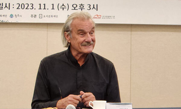 “제 작품에서 동시성을 찾아볼 수도 있고, 여행을 하면서 많은 장소와 시간을 보실 수 있을 텐데요. 시간과 장소는 바뀌더라도 사람들이 현실을 살아가긴 힘이 듭니다. 예를 들면 유럽이든 한국이든 혹은 지금 현재 이슈가 되고 가자지구이든 어디에 사는 사람이든 간에. 희망은 미래를 향해 있고 기억은 과거를 향해 있지요. 현재 지금 이 순간을 살아가는 것은 길이 매우 좁습니다. 예를 들면, 제 작품 『최후의 세계』의 오비디우스는 2000년 전 경기장에서 아우구스티누스 황제 앞에서 말을 하는데요. 그것이 어떤 하나의 상황, 그림이라고 볼 수 있겠지만, 동시에 과거와 현재, 미래에 살고 있는 사람들이 고통과 행복과 걱정을 통해 그것을 느낄 수 있다는 것이죠. 결국 과거이지만 현실이 되고, 장소는 다르지만 소설 속에서 그것을 읽으면서 똑같이 느낄 수 있는 것입니다. 앙코르와트의 건축물이나 중국의 만리장성, 로마의 위대한 건축물들은 그대로 있지만, 그것을 만든 사람들은 모두 죽고 없죠. 제가 글로서 시도하고 싶은 것은 그 사람들을 상상하는 것입니다. 그들이 건축물을 만들면서 무엇을 보고 무엇을 갈망했는지, 어떤 것에서 고통을 받았는지, 그들의 일상은 어떠했는지를. 그들의 감정과 행복과 고통 같은 것들을 다시 살아나게끔 만드는 것이 제 글이 하는 일이고요. 제 글 안에선 공간 및 시간적인 섞임이 나타난다고 생각합니다.”