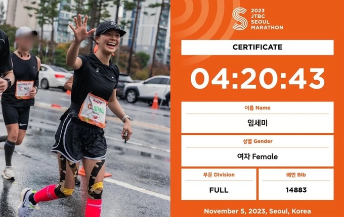 배우 임세미(36)가 마라톤 풀코스를 4시간 20분대에 완주했다.