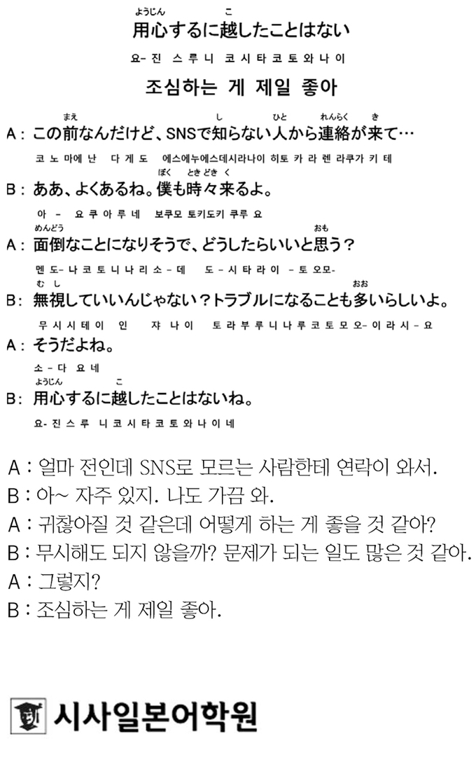 [시사일본어학원의 초단기 일본어 회화] 조심하는 게 제일 좋아 입력 : 2023-11-08 18:41:03 수정 : 2023-11-08 18:41:03 구글 네이버 유튜브 Copyright ⓒ 세계일보. 무단 전재 및 재배포 금지 세계일보
