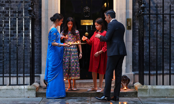영국 최초의 인도계 정상인 리시 수낵 총리(오른쪽)가 12일(현지시간) 런던 다우닝가 10번지 총리관저 앞에서 가족과 함께 촛불을 밝히며 힌두교 전통 축제 디왈리에 동참하고 있다. 디왈리는 집집마다 수많은 작은 등불을 밝혀 힌두교 신들을 맞이하는 축제로, 힌두 달력 8번째 달의 초승달이 뜨는 날을 즈음해 인도 전역에서 펼쳐진다.