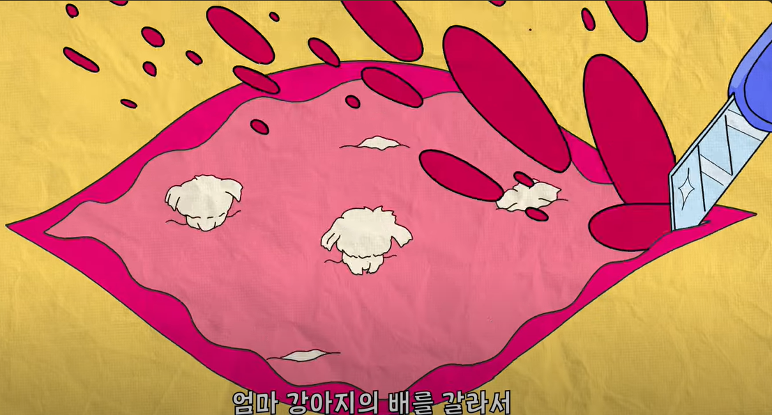 영상 속 엄마는 아이에게 현실을 있는 그대로 설명한다. 그는 “강아지들을 철창에 가둬놓고 발정제 주사를 잔뜩 맞혀서 강제로 여러 차례 교배를 시키고, 임신한 지 60일 정도 지나면 엄마 강아지의 배를 꺼내 강아지들을 꺼낸단다. 엄마 강아지의 배는 다시 꿰매 주면 돼. 이미 여러 번 그렇게 했거든”이라고 말한다.