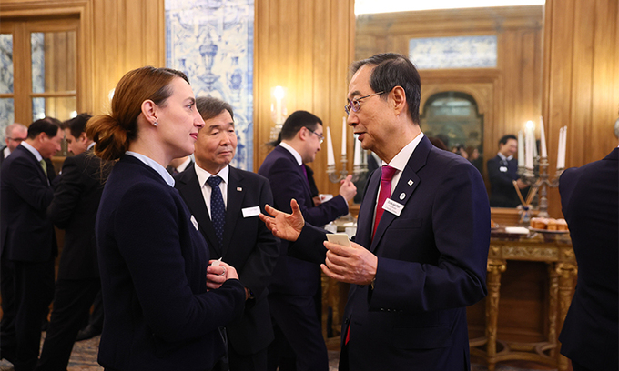 한덕수 국무총리(오른쪽)가 14일(현지시간) 프랑스 파리 메종드부산에서 대한상공회의소 주최로 열린 국제박람회기구(BIE) 회원국 대표 조찬세미나에 참석해 관계자들과 대화하고 있다. 2030부산엑스포 막판 총력전에 나선 한 총리는 이날 개회사에서 지구적 도전 과제인 기후변화에 대응하는 한국 정부의 정책과 노력을 설명하며 “부산엑스포가 이를 해결하기 위한 논의의 장이 되기를 기대한다”고 말했다.