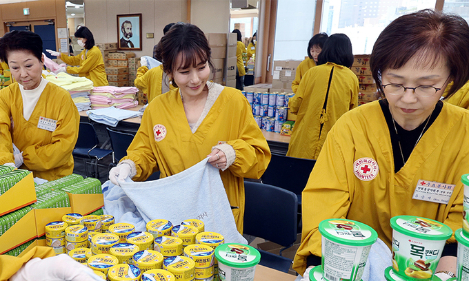 김영호 통일부 장관의 부인 남미경씨(왼쪽부터)와 한동훈 법무부 장관 부인 진은정씨, 방문규 산업통상자원부 장관 부인 유금재씨가 15일 서울 중구 대한적십자사 서울사무소에서 ‘2023 사랑의 선물’을 만들고 있다. 이날 행사에는 장차관 및 15개국 주한 외교대사 배우자 등 70여명이 참석했는데, 한 장관의 부인인 진 변호사가 공개 활동에 나선 것은 지난해 5월 한 장관이 취임한 이후 1년 6개월 만에 처음이다.