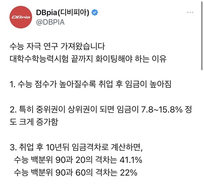 앞서 디비피아는 2024학년도 수능을 하루 앞둔 지난 15일 공식 SNS인 엑스 계정에 “수능자극 연구 가져왔다”며 “대학수학능력시험 끝까지 화이팅해야 하는 이유”라는 내용의 글을 올렸다. 이 글에는 ▲수능 점수가 높아질수록 취업 후 임금이 높아짐 ▲특히 중위권이 상위권이 되면 임금이 7.8~15.8% 정도 크게 증가함 ▲특히 영어 성적에서 임금 상승 정도의 차이가 분명하게 나타남 ▲다만 수능 백분위 80이상이 되면 취업확률이 떨어짐 등 문장도 포함됐다.