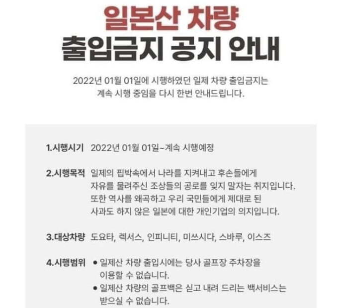 이에 따라 일본산 차량은 해당 골프장에 출입 시 주차장을 이용할 수 없다. 또 일제산 차량의 골프백을 싣고 내려주는 백 서비스도 받을 수 없다.