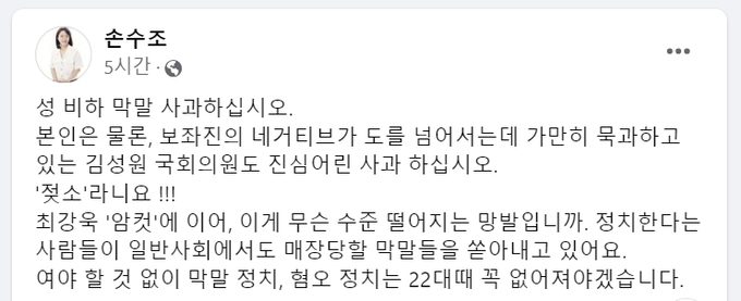 이 사태에 대해 손 대표는 이날 자신의 페이스북에 “성 비하 막말 사과하라”며 “본인은 물론, 네거티브가 도를 넘어섰다”고 밝혔다.