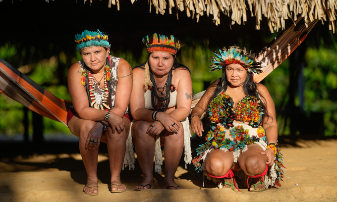브라질 아마조나스주 카누타마 인근에 거주하는 아마존 원주민 ‘주마족’의 세 자매 만데이 주마(왼쪽부터), 마야 주마, 보레아 주마가 그물침대에 걸터앉아 있다. 세 자매의 부친 아루카 주마는 2021년 2월 벌목꾼이 옮긴 신종 코로나바이러스 감염증(코로나19)으로 사망했다. 향년 86~90세로 정확한 나이도 알 수 없었던 아루카는 주마족의 마지막 남성이었다. 아루카마저 그의 조상처럼 외지인의 침입에 희생된 원주민이 됐다. 남성만이 부족의 대를 잇는 관습을 가진 주마족의 마지막 남성이었던 그의 죽음으로 부족의 많은 전통과 의식이 절멸할 것이란 우려가 커졌다. 2년여가 흐른 후 아루카의 세 딸은 모두 다른 부족과 결혼했지만 자녀들의 이름에 모계쪽 성(姓) ‘주마’를 넣고, 부족의 전통을 가르치는 등 주마족을 지키기 위한 ‘투쟁’을 지속하고 있다.