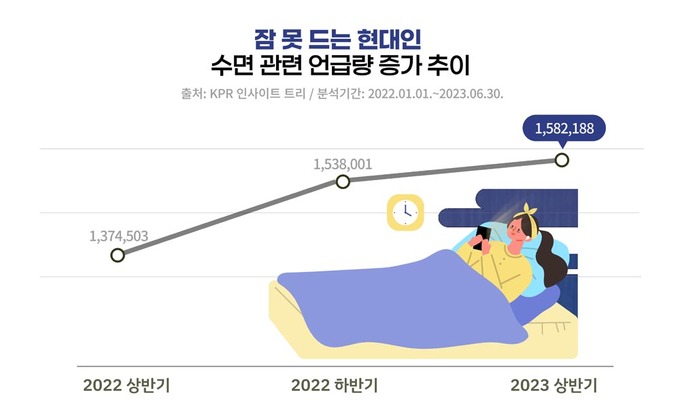 종합커뮤니케이션그룹 KPR(사장 김주호) 부설 KPR 디지털커뮤니케이션연구소가 ’수면’에 관한 245만건의 빅데이터를 분석 결과, 2023년 상반기 ‘수면’에 대한 관심이 전년 동기 대비 15% 증가한 것으로 나타났다.