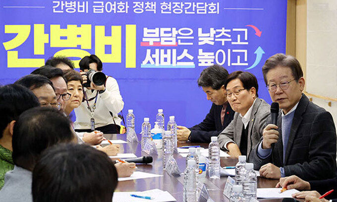 민주당 이재명 대표는 28일 서울 구로구의 한 요양병원에서 연 정책간담회에서 간병파산, 간병살인 등 사회 문제를 낳고 있는 간병의 어려움을 소개하며 “간병비 전부를 급여화하는 건 당장은 비용 부담이 크다고 해 순차적으로 요양병원부터 범위를 넓혀나가는 것으로 추진하려 한다”고 했다. 이개호 정책위의장은 “당장 내년 예산에 80억원의 10개소 시범 사업비를 확보해 차근차근 준비해 나가겠다”고 했다.