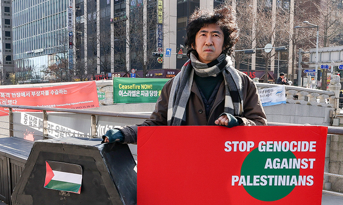 이스라엘과 무장 정파 하마스 간 장기화하는 전쟁의 상흔을 보며 1인 시위에 나선 교수가 있다. 이성재 충북대 역사교육과 교수를 지난달 28일 서울 종로구 주한 이스라엘 대사관 앞에서 만났다. 시위 중이던 그는 한 손에는 ‘이스라엘은 팔레스타인 학살을 중단하라’고 쓰인 피켓, 다른 한 손에는 팔레스타인 국기와 영정 액자 사진을 붙인 관을 들고 있었다.