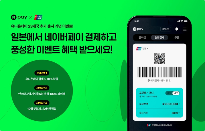 네이버페이는 국내 여행객들이 많이 찾는 해외 여행지인 일본에서 연말까지 다양한 현장결제 프로모션을 진행한다. 올해 12월 31일까지, 일본에서 ▲2000원 이상 첫 현장결제 시 2000원을 포인트로 지급(유니온페이, 알리페이플러스 가맹점) ▲네이버페이X유니온페이 결제액의 10% 포인트 적립(건당 최대 5000원, 10회 한정) ▲네이버페이X유니온페이 결제 사진을 인스타그램에 업로드한 5명을 추첨해, 12월 일본 내 네이버페이X유니온페이 결제액 100% 포인트 페이백(최대 100만원) 등 풍성한 혜택을 제공한다.