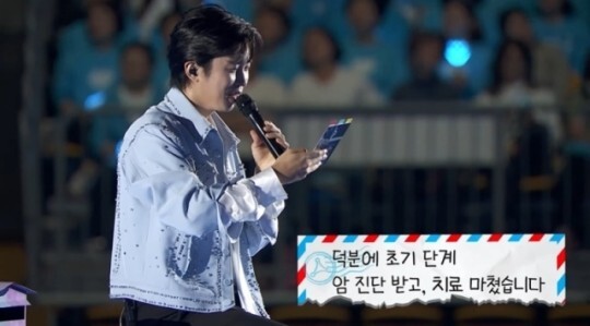 임영웅은 '영웅씨 덕분에 건강검진으로 암 조기 진단받고 치료했다. 대장내시경은 먹는 약물이 너무 역겹고 힘들어 매번 피하고 안 했는데 영웅 씨가 하라고 해서 꿀물처럼 느껴져서 편안하게 했다. 덕분에 초기단계 암 진단을 받고 치료를 마쳤다. 정말 감사하다'라고 사연을 읽었다.
