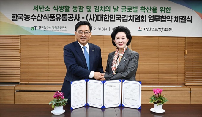 한국농수산식품유통공사(사장 김춘진)은 20일 서울 양재동 aT센터에서 (사)대한민국김치협회(회장 이하연)와 글로벌 김치의 날 제정과 저탄소 식생활 확산을 위한 업무협약을 체결했다.