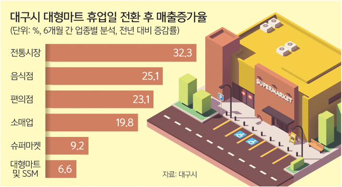 전국의 대형마트 의무휴업일 평일 전환 움직임은 규제 완화가 지역 상권과 경제 활성화에 긍정적 효과가 있음이 실제 데이터로 확인됐기 때문이다. 대구시가 지난 2월 의무휴업일 평일 전환 후 6개월 효과를 분석한 결과 슈퍼마켓, 음식점 등 주요 소매업 매출이 지난해 같은 기간 대비 19.8%, 대형마트와 기업형 슈퍼마켓(SSM) 매출은 6.6% 증가했다. 소매업종 매출 증가율은 의무휴업일을 일요일로 유지하는 부산(16.5%), 경북(10.3%), 경남(8.3%)보다 높았다. 바뀐 휴업일의 전통시장 매출액도 전체적으로 신장한 것으로 나타났다. 2·4주 일·월요일 매출액 증가율은 34.7%로 전체 기간 증가율 32.3%보다 2.4%가량 웃돌아 의무휴업일 평일 전환이 전통시장 매출에도 긍정적인 영향이 있음을 입증했다.