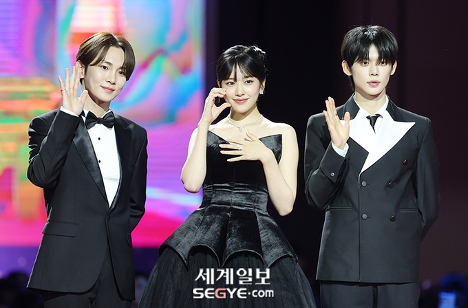 가수 키, 안유진, 연준(사진 왼쪽부터)이 25일 오후 인천 영종도 인스파이어 아레나에서 열린 ‘2023 SBS 가요대전’의 레드카펫 행사에 참석해 포즈를 취하고 있다.