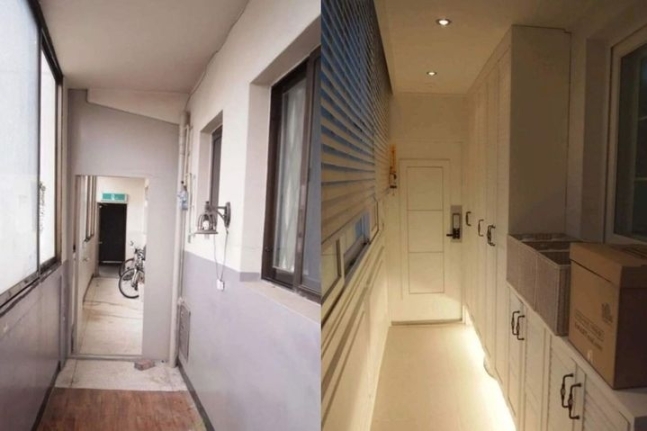 A씨가 촬영한 사진에는 아파트 복도에 중문이 설치되는 과정이 담겨 있었다. 지저분한 복도는 깔끔한 장판으로, 외부 샤시는 새 창호로 교체됐다. 흰색으로 통일된 벽지와 신발장이 눈에 띄었고, 바닥에는 간접 조명도 설치돼 있었다. 중문에 도어락까지 설치되면서 공용 공간이었던 복도는 개인 공간으로 탈바꿈했다.