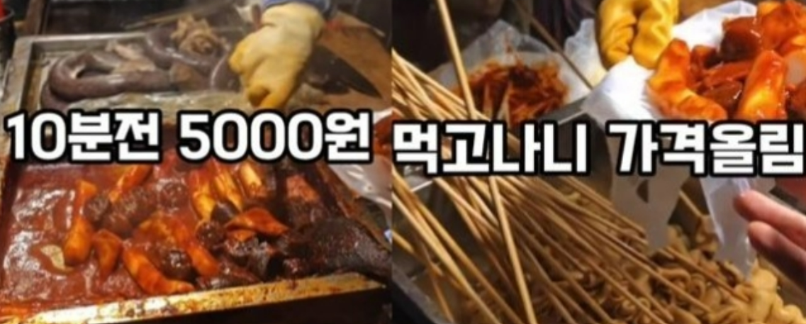 영상에는 순대를 떡볶이에 버무려 그릇에 담는 포장마차 아주머니의 모습과 함께 '10분 전 5000원, 먹고 나니 가격 올림. 6000원이라는 말에 먹던 사람들 입맛 뚝'이라는 자막이 삽입됐다.