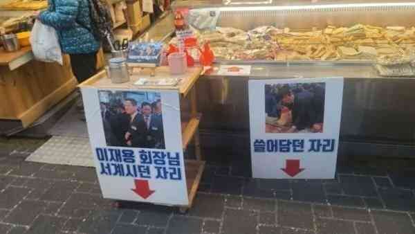 이후 어묵집 측은 매장에 ‘이재용 회장님 서 계시던 자리’, ‘쓸어 담던 자리’ 등을 표시해 방문객과 손님들을 맞고 있다.