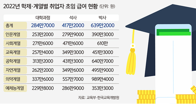 2022년 석·박사 출신 취업자의 초임은 의약(737만6000원), 사회(533만2000원), 공학(498만5000원), 자연(402만원), 교육(387만8000원), 인문(307만9000원), 예체능(307만4000원) 순으로 많았습니다. 6년 전과 비교해보면 자연(60만3000원, 17.6%), 공학(65만8000원, 15.2%), 의약(82만9000원, 12.7%), 사회(47만9000원, 9.9%), 인문(27만3000원, 9.7%), 교육(26만6000원, 7.4%), 예체능(19만9000원, 6.9%) 순으로 증가율이 높았습니다.