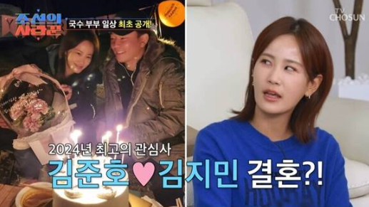 김지민은 “원래 (김준호와) 선후배 사이라 이미 엄마와 몇 번 봐서 어색하진 않았다. 그래도 사귀고 나서 가니까 (김준호가) 되게 긴장했다. 정장을 입고 갔다. 엄마가 꽃을 좋아해서 꽃을 한 아름 사서 갔다”고 전했다.
