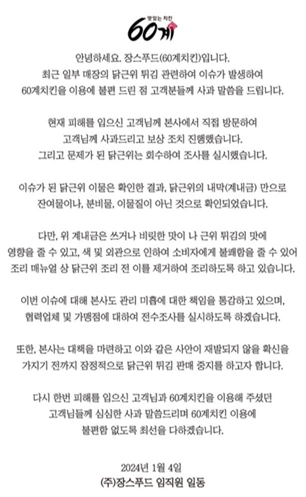 특히 "대책을 마련하고 이와 같은 사안이 재발되지 않을 확신을 가지기 전까지 잠정적으로 닭근위 튀김 판매 중지를 하고자 한다"며 "피해를 입으신 고객님과 60계치킨을 이용해 주셨던 고객님들께 심심한 사과 말씀을 드리며 60계치킨 이용에 불편함이 없도록 최선을 다하겠다"고 사과했다.