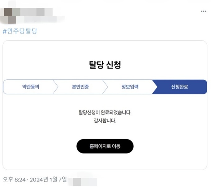 한 이용자는 “나의 젊은 시절 열정을 바쳤던 민주당을 탈당한다”는 글과 함께 탈당 신청 완료 인증샷을 올렸고, 다른 이용자는 “반칙과 특권 없는 세상에서 살고 싶다”며 캡처한 탈당 완료 안내 카카오톡 메시지를 엑스 계정에서 공개했다.