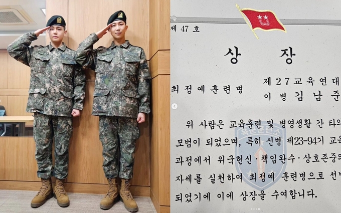 16일 RM은 자신의 인스타그램에 이날 충남 논산 육군훈련소에서 열린 신병교육 수료식에 뷔와 함께 참석한 사진과 영상을 올렸다. 영상 속 RM과 뷔는 란히 최정예 훈련병으로 뽑혀 표창을 받았다.