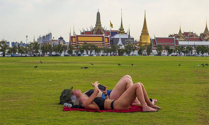 16일(현지시간) 홍콩 SCMP 등에 따르면 태국 방콕에 있는 사남루앙(Sanam Luang) 공원에서 외국인 관광객 2명이 수영복을 입은 채 햇볕을 쬐는 사진이 소셜미디어에 올라왔다. 이를 본 태국인들은 ‘부적절한 행동’이라며 비난하고 있다.