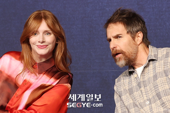할리우드 배우 브라이스 달라스 하워드(사진 왼쪽)와 샘 록웰이 18일 오전 포시즌스 호텔 서울에서 열린 액션 블록버스터 영화 ‘아가일’ 내한 기자간담회에 참석해 취재진의 질문을 경청하고 있다.