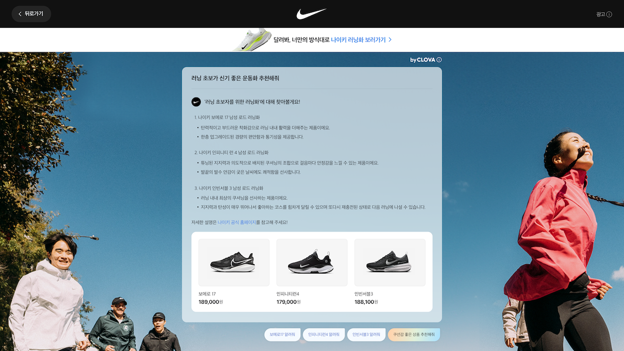 “나이키 러닝화를 추천해줘”를 입력해보니 3종류의 운동화와 사진을 제공한다. 하단에는 ‘OOO 알려줘’와 같은 제품 추가 정보를 물을 수 있는 버블이 보인다.