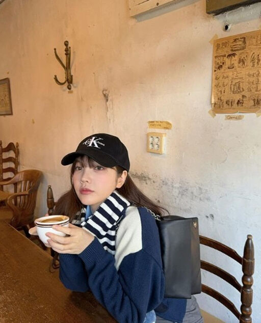 사진 속 수스는 카페로 추정되는 곳에서 차를 마시고 있었으며, 푸른 계열의 상의와 회색 치마 레깅스를 연계한 겨울 패션을 선보였다.
