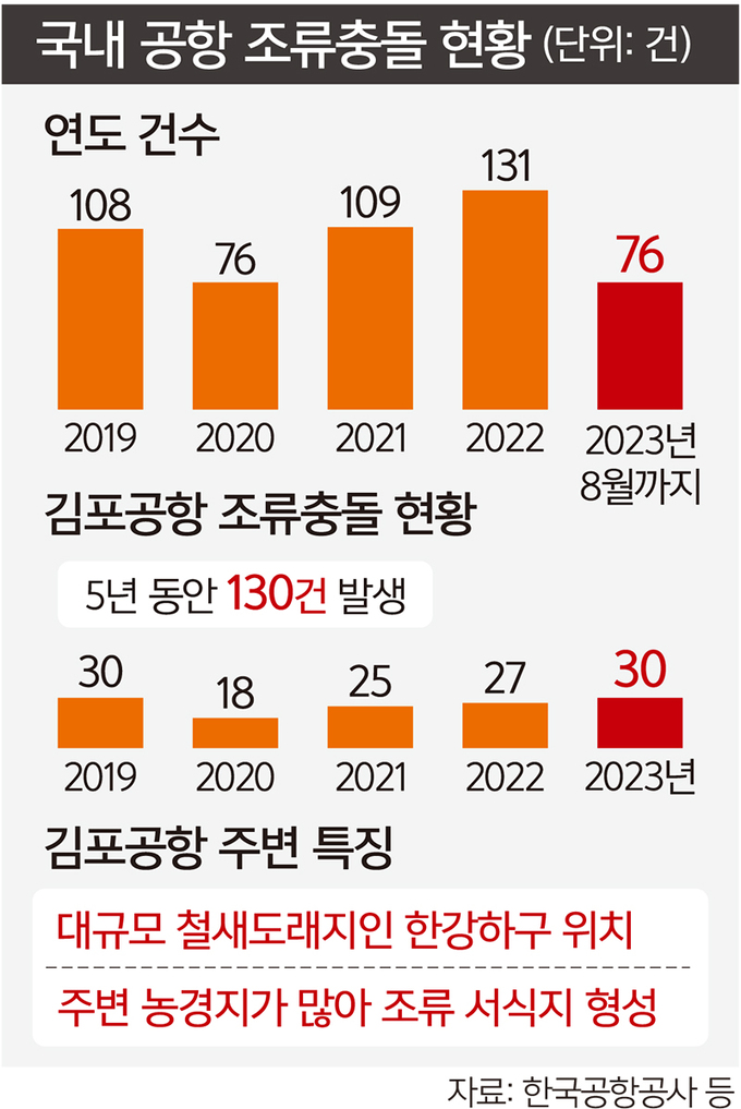 김포공항 주변에는 대규모 철새도래지인 한강하구가 있는 데다 주변에 농경지가 많아 조류 서식지가 형성된 것이 영향을 미치고 있는 것으로 분석됐다.