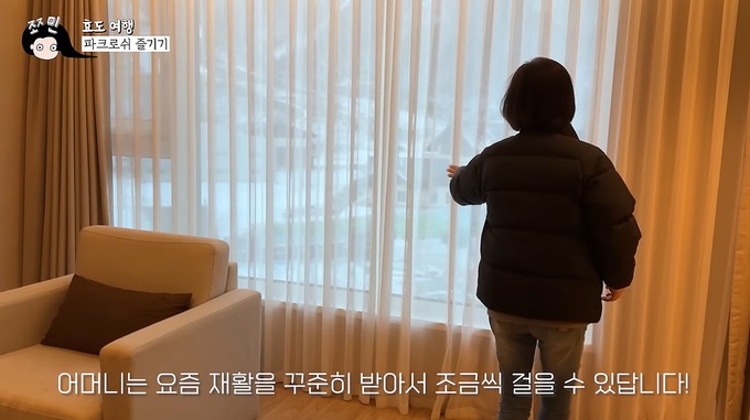 앞서 조씨는 이날 자신의 유튜브 채널에 15분여 분량 가족여행 영상을 올렸다. 강원 정선의 한 리조트에 도착한 정 전 교수는 숙소에서 ‘커텐을 걷어 달라’는 조씨의 말에 창가로 이동했고, 이 대목에서 조씨는 영상에 ‘어머니는 요즘 재활을 꾸준히 받아서 조금씩 걸을 수 있답니다’라는 설명 자막을 덧붙였다.
