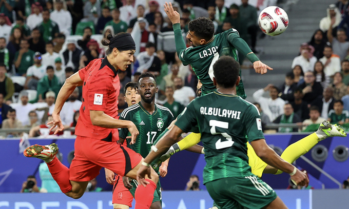 한국 축구대표팀 조규성(왼쪽)이 31일 카타르 알라이얀의 에듀케이션 시티 스타디움에서 열린 카타르 아시안컵 사우디아라비아와의 16강전 후반 추가시간 극적인 헤더 동점골을 넣고 있다.